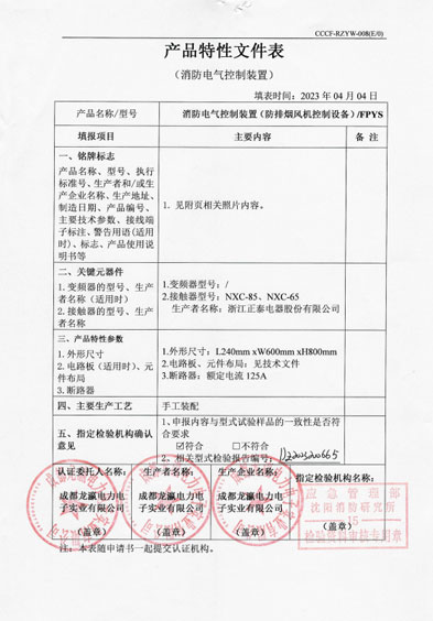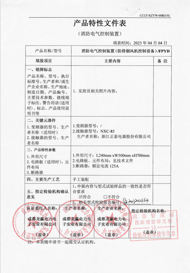 消防电气控制装置(防排烟风机控制设备)FPYS产品特性文件表