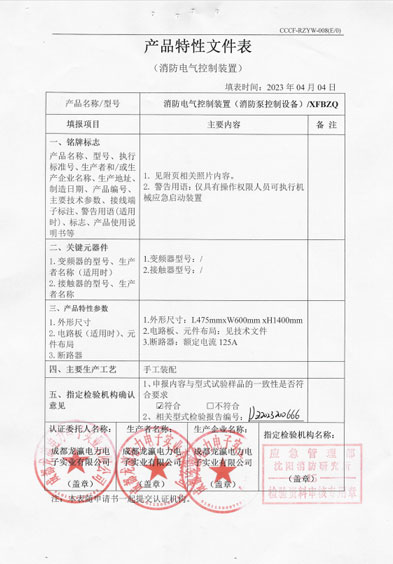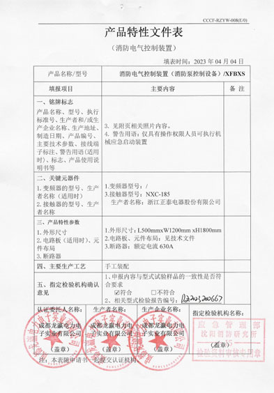 消防电气控制装置(消防泵控制设备)XFBZQ产品特性文件表